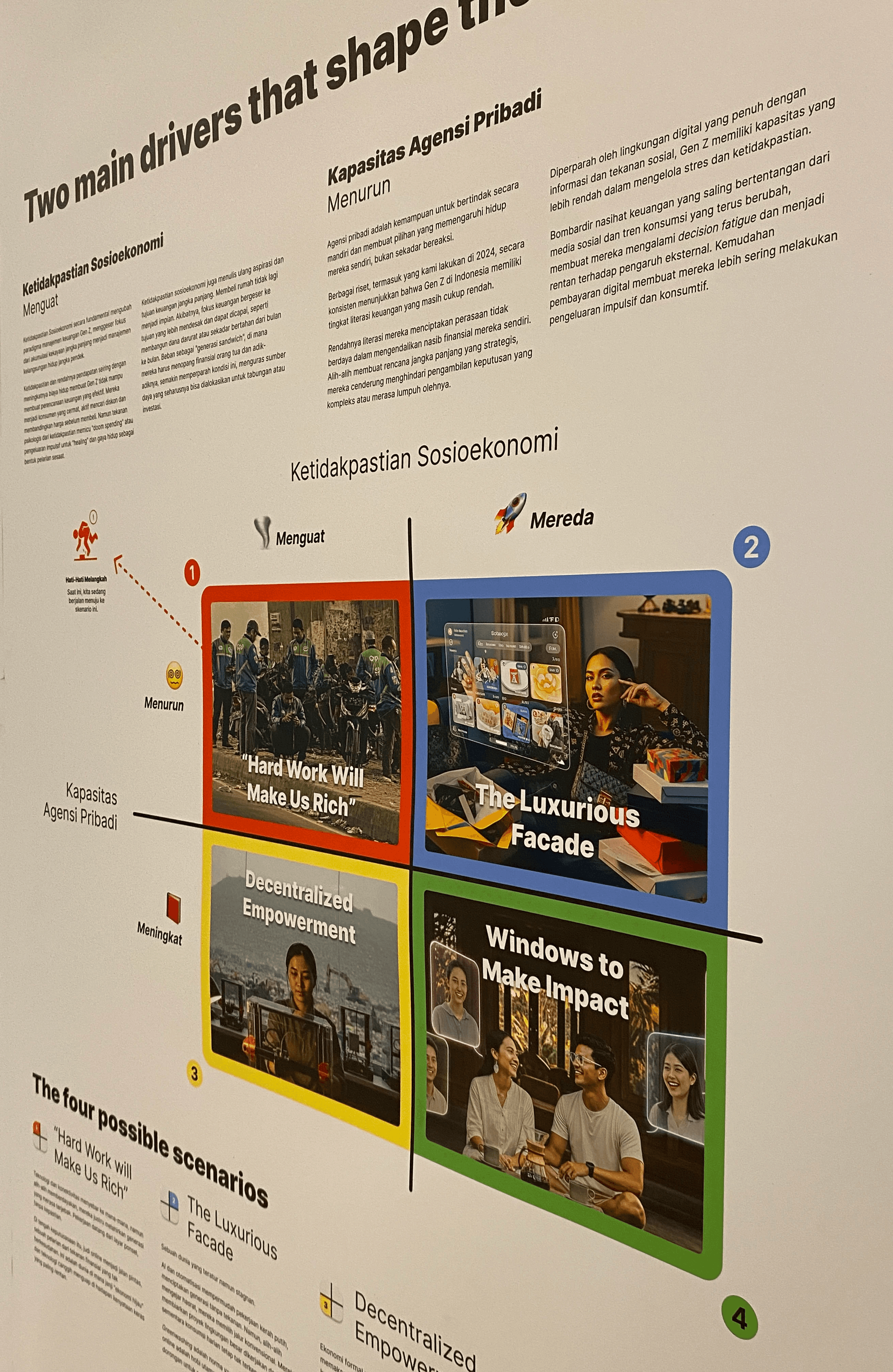 The scenarios were created by considering the two main drivers that may strongly influence Gen Z's financial behavior that emerge from our research.